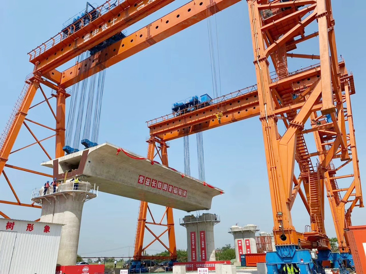 初夏的沅江之畔暖陽和煦,全長32.6米、重達(dá)828噸的箱梁“平躺”在兩臺重型提梁機(jī)之間,等待架梁指令。常德市、漢壽縣及縣直單位、鄉(xiāng)鎮(zhèn)、建設(shè)單位代表共同見證了這一歷史時刻。隨著參建代表共同啟動架梁按鈕,常益長鐵路首榀箱梁被鋼絞索緩緩提起,不到5分鐘就被穩(wěn)穩(wěn)安放在9.5米高的橋墩承臺上,現(xiàn)場霎時間掌聲雷動。