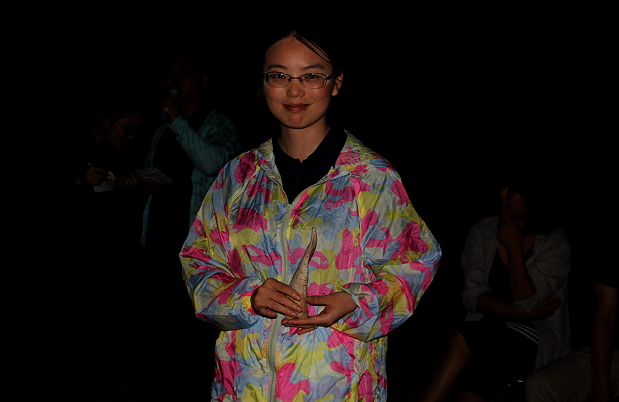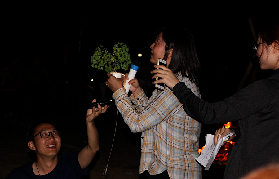 晚會最后,各隊(duì)拿出各自行軍過程中尋得的寶物,在這里微特公司首次愛心拍賣會溫情上演。(上圖為Supreme隊(duì)持寶人正在講解她所持的盆栽寶貝,左右兩邊的隊(duì)員正在為寶貝打燈光)