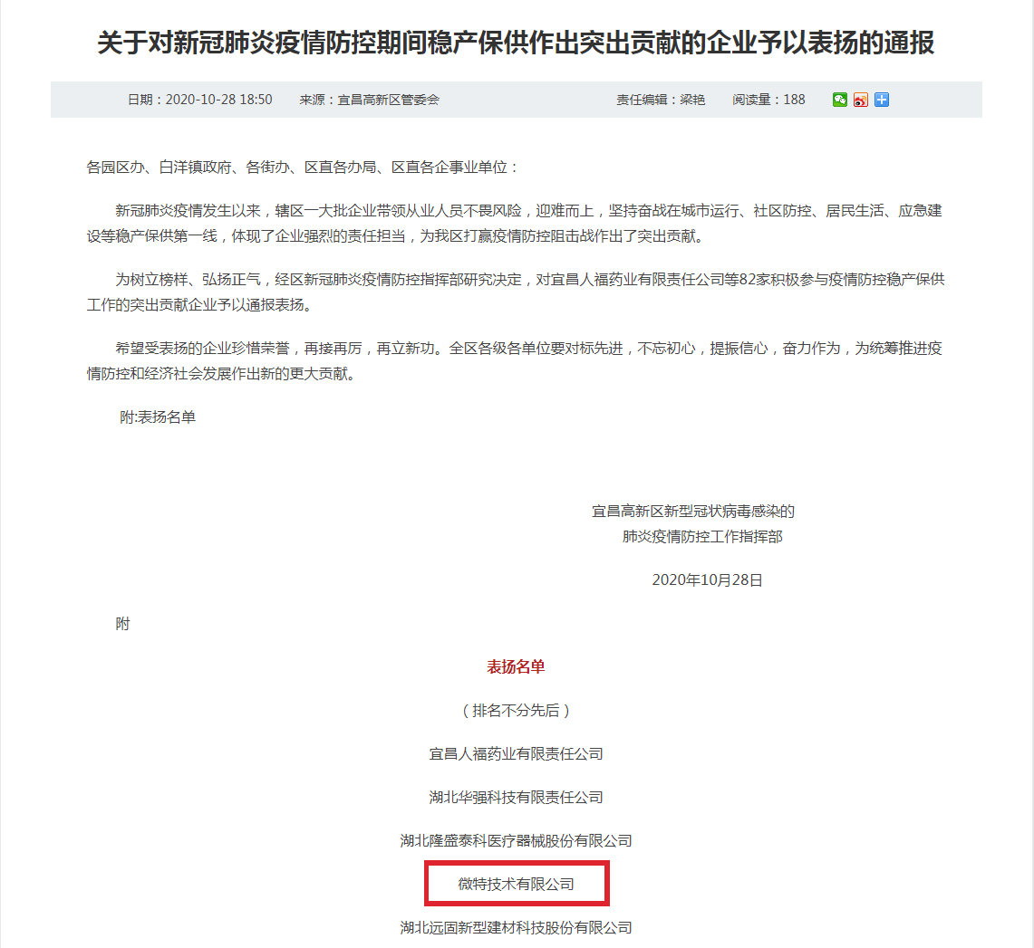 近期,宜昌高新區(qū)新型冠狀病毒感染的肺炎疫情防控工作指揮部發(fā)布了《關(guān)于對(duì)新冠肺炎疫情防控期間穩(wěn)產(chǎn)保供作出突出貢獻(xiàn)的企業(yè)予以表?yè)P(yáng)的通報(bào)》,微特技術(shù)有限公司位列表?yè)P(yáng)名單。