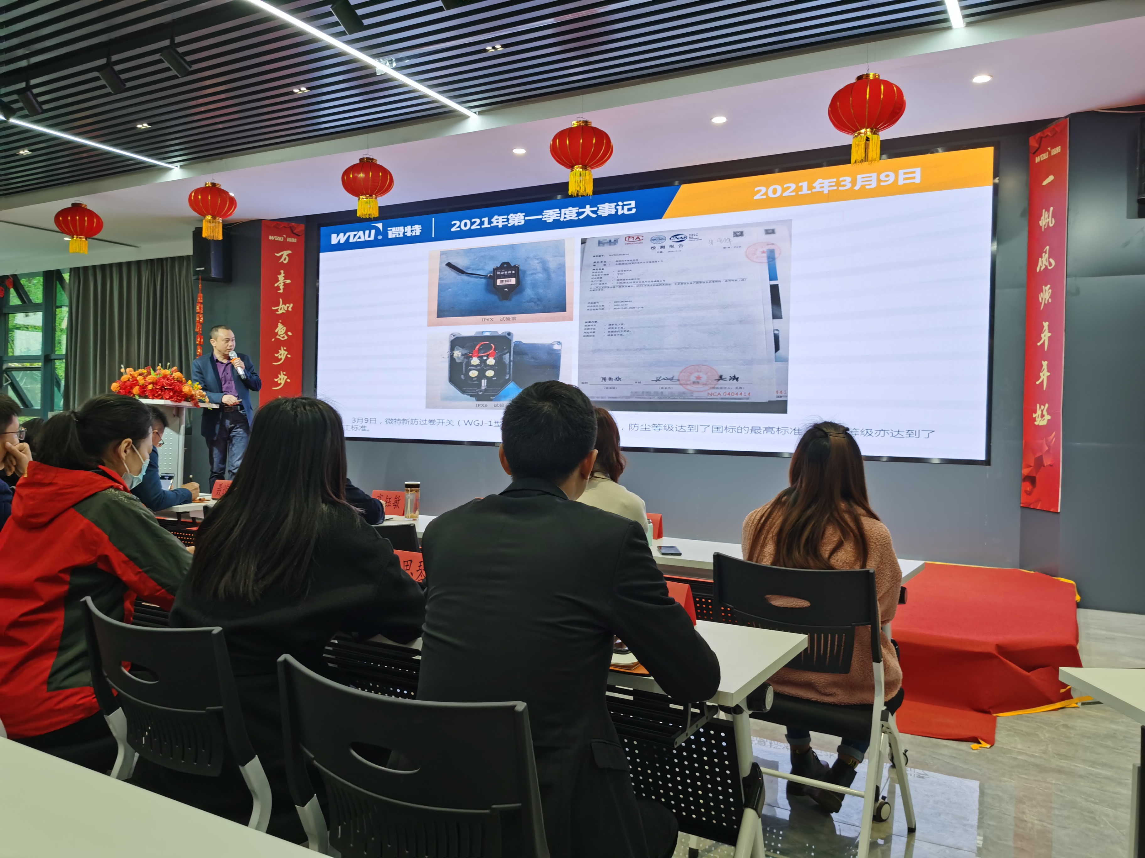 會(huì)議開(kāi)始,輪值CEO李彬?qū)Φ谝患径冗M(jìn)行了總結(jié)回顧,季度伊始聶董發(fā)表了“感恩有你攜手同行,牢記使命整裝再發(fā)”的2021年新年致辭,隨后在所有同仁的見(jiàn)證下湖北傳感物聯(lián)產(chǎn)業(yè)技術(shù)研究院揭牌儀式成功舉辦,同時(shí)微特度過(guò)了19歲生日。聶董作為人大代表參加了湖北省第十三屆人民代表大會(huì)第五次會(huì)議的系列會(huì)議,輪值CEO李彬被授予“宜昌市優(yōu)秀青年科技工作者”稱(chēng)號(hào),微特智慧谷總經(jīng)理郭麗麗榮獲宜昌市“杰出創(chuàng)業(yè)女性”榮譽(yù)稱(chēng)號(hào)。這一季度微特參與三項(xiàng)世界第一的常泰長(zhǎng)江大橋建設(shè),新防過(guò)卷開(kāi)關(guān)(WGJ-1型)通過(guò)IP66防護(hù)等級(jí)認(rèn)證,海工、船舶、水電、訂單保障中心、研發(fā)中心、經(jīng)營(yíng)管理部、孵化器等各部門(mén)都取得了優(yōu)異的工作成果。