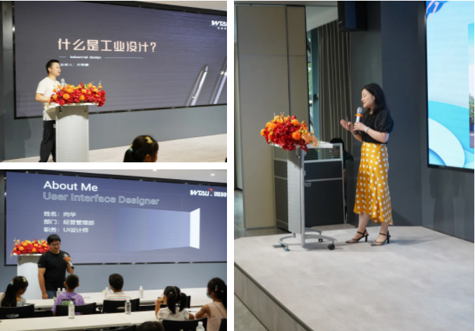 第三站在工業(yè)設(shè)計(jì)中心會議室,由微特工業(yè)設(shè)計(jì)師、UI設(shè)計(jì)師以及外貿(mào)銷售的三位老師分別為孩子們介紹什么是工業(yè)設(shè)計(jì)?UI是什么?以及外貿(mào)是怎么做的?讓孩子們感受到了未來的多樣性,也希望通過這些演示啟發(fā)孩子們,讓他們找到自己真正的興趣所在,在今后的學(xué)習(xí)中能夠找到為之努力的方向。