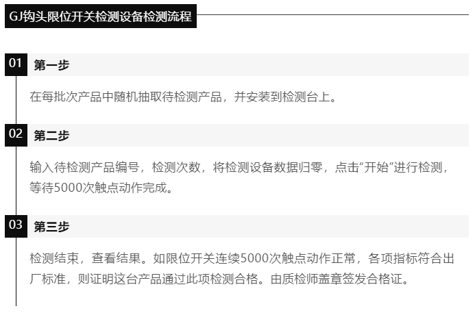 微特GJ鉤頭限位開關(guān)是用于起重機(jī)械鋼絲繩防過卷限位的一種電器自動保護(hù)開關(guān)。它與適當(dāng)重量的重錘配套,利用吊鉤的上下運動托起或放下重錘時斷開或通導(dǎo)開關(guān),達(dá)到限制鋼絲繩過卷和吊鉤在一定高度內(nèi)升降的目的。 微特,專心做起重機(jī)安全領(lǐng)域的waitor,將品質(zhì)控制貫穿服務(wù)全流程,為保障GJ鉤頭限位開關(guān)的品質(zhì)合格,針對性研發(fā)了GJ鉤頭限位開關(guān)檢測設(shè)備。 ![]() 在GJ鉤頭限位開關(guān)出廠前,由資深質(zhì)檢員對限位開關(guān)進(jìn)行連續(xù)5000次觸點動作的品質(zhì)檢測。 ![]() ![]() ![]() |